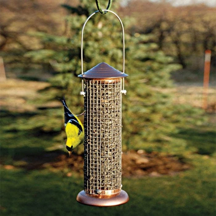 Seed feeder with bronze toned base and cap holds up to 1/2- lb. pound of sunflower seeds, safflower seed, peanuts or cracked corn. The 1/4-in spacing of the steel mesh provides a sturdy structure and offers plenty of room for smaller birds to cling and dine. It is easy to fill and clean this feeder by sliding the metal roof up the included hanger . Feeder attracts cardinals, flickers, goldfinches, grosbeaks, jays, juncos, nuthatches, redpolls, sparrows, starlings, titmice and wrens.