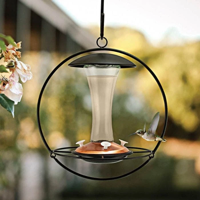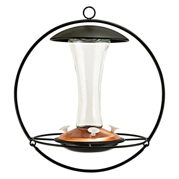 Modern design black metal sphere suspends this hummingbird feeder with a copper accented nectar reservoir. Holds 16 oz. of nectar with four feeding ports. Unscrew bottle from reservoir to fill. Heavy metal cable included for hanging. Decorative and functional, a beautiful addition to any backyard or garden!