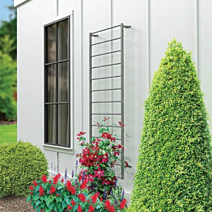 The industrial wall & ground trellis is constructed of sturdy square steel tubing with a weather-resistant dark gray powder-coated finish. This trellis can be wall mounted or set against fencing, exterior walls, or a brickwork wall. Includes optional hardware for floating wall mount or in-ground installation. A great option for vertical gardening and support for climbing vine plants. This trellis system is a durable square steel tubing welded to give the trellis strength. The trellis panel features a matte black powder-coated finish for durability and added rust resistance. Climbing vine plants, like clematis, honeysuckle and other flowering vine plants or shrubs like bougainvillea look great winding around this trellis as they wrap around the vertical and crossbars.