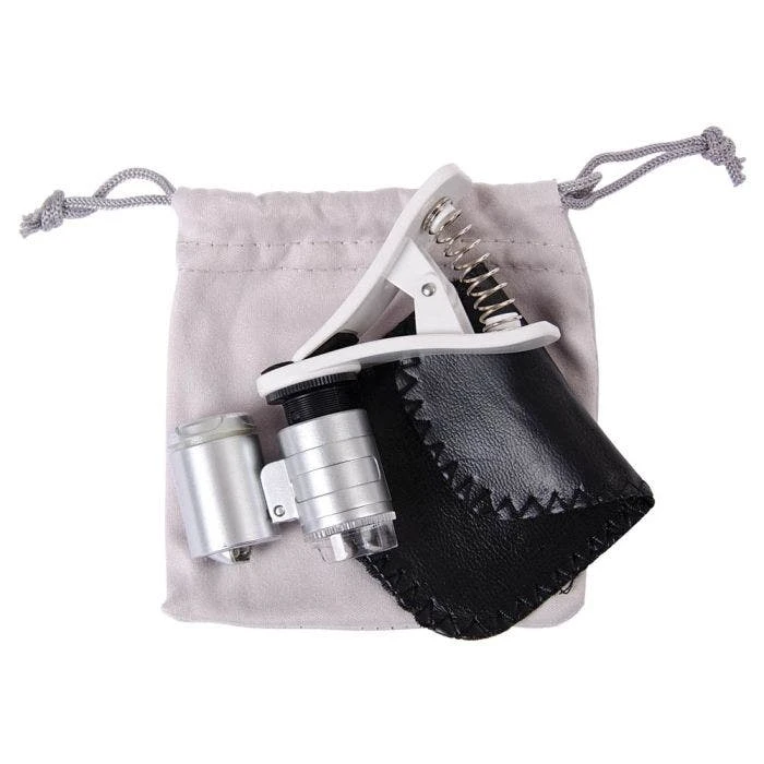 Lightweight and compact, this 60X microscope is designed to clip onto mobile phones that are equipped with a camera. Can be used independently when unscrewed from the clip.