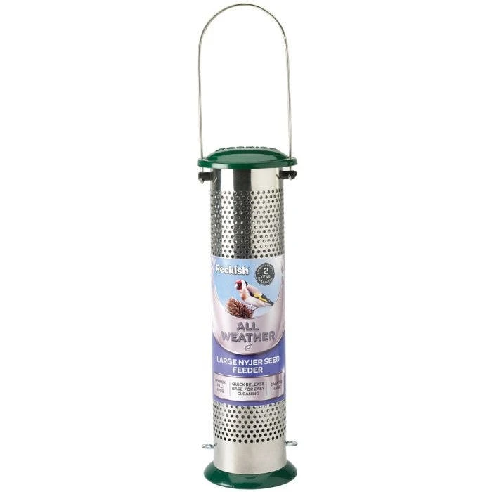 Peckish All Weather Nyjer Seed Feeder is made from strong and durable materials. This feeder features a clip-release base for easy refilling and a slanted bottom to push the seed to the porches. This feeder also features a strong hanging bar. Small, perforated holes for easy feeding. Circular perch allows for multiple birds to feed. 11.75 H”