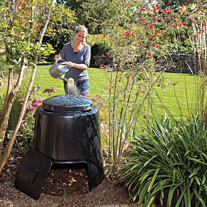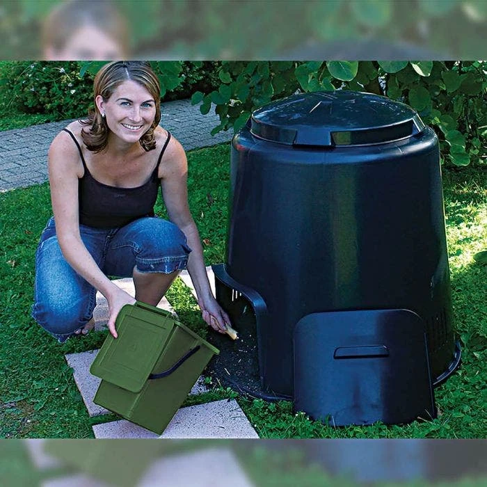 Eco composter turns kitchen waste into rich nutritious compost. Constructed from 100 percent recycled UV-resistant polypropylene. Lid rotates providing a large feed opening when filling. Exit door on bottom slides up for easy compost removal. Lateral ventilation slots to accelerate composting. Smooth interior and exterior for easy cleaning. Composter sits directly on ground. Made in Germany.