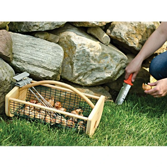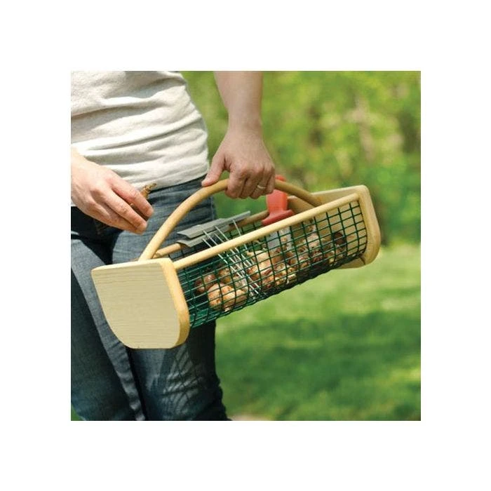 Harvest and wash plants, fruits and vegetables (especially carrots and potatoes!), or discover one of the hundreds of other uses that the hod lends itself to inside and out any time of the year. Constructed with 3/4-inch thick pine sides and birch side rods, it also has a sturdy, food grade PVC-coated wire body, and a steam bent handle for a handsome look. 16in L x 9in W x 7in H. Can hold 8 quarts or 1 peck. Ship wt 3 lb.