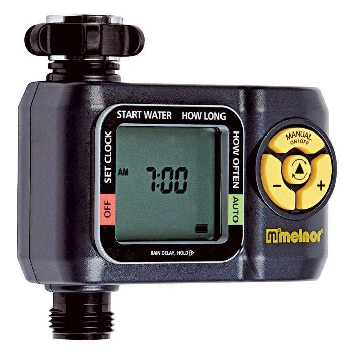 The Melnor AquaTimer 1 zone Digital Water Timer Model 63015 is an automatic water timer designed to make watering your plants easier by automatically turning the water on and off according to the schedule you set. It has a large LCD display and a programmable frequency for watering as often as every hour or as little as every 7 days. It requires two AA batteries (not included) and comes with a 7 year limited warranty.