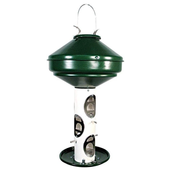 Woodlnk Extra-Large Capacity heavy-duty feeder holds up to 15 lbs. of mixed seed. Internal stainless steel seed diverter keeps seed flowing. 6 clear ports keep seed levels visible. Air holes at the bottom of the tube. Roof lifts open for quick filling. E-Z Clean Pop-Out base; Snap-apart design for quick and easy cleaning. Clips on the roof keep it closed securely. Fully assembled, hangs from sturdy tree branch or heavy duty outdoor support^ Hanger included. Made in USA.