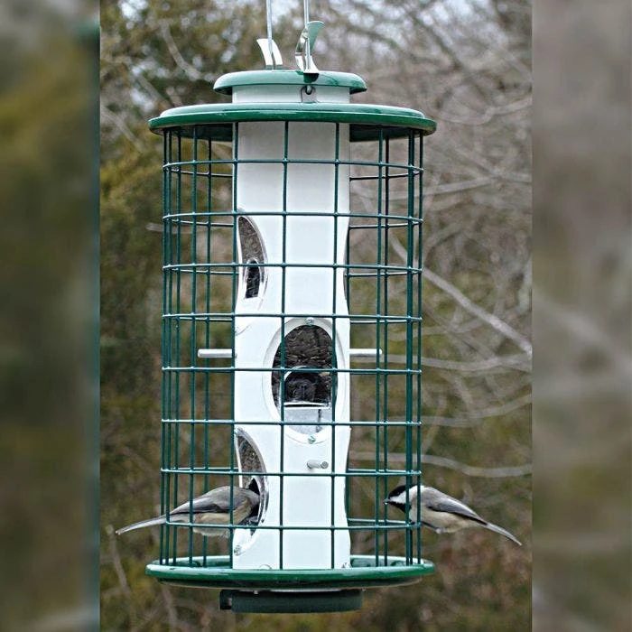 This squirrel resistant feeder features powder-coated metal grids that make it easy for birds to feed and move around while protecting them from predators. This caged feeder features 6 feeding ports an E-Z Clean snap-out base. Holds up to 4.5 pounds of mixed seed. Mixed seed attracts Goldfinches, Finches Chickadees, Nuthatches, Redpolls, Siskins, Juncos, Titmice, Woodpeckers and more. Made in USA.