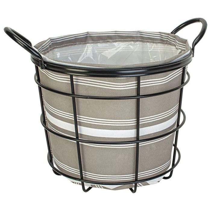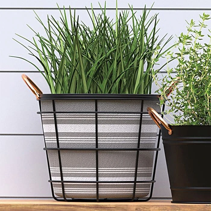 Modern Farmhouse designs are on-trend, classic looking garden accessories to decorate your living spaces. This wire bushel basket features an all weather bistro print fabric liner is trendy and looks great indoors or outside! Pop in potted herbs or plants in the kitchen, or use outdoors for summer fun essentials. The sewn-in poly Lining prevents leaking & soiled Liner. Multi-Purpose Containers are great for garden or home.