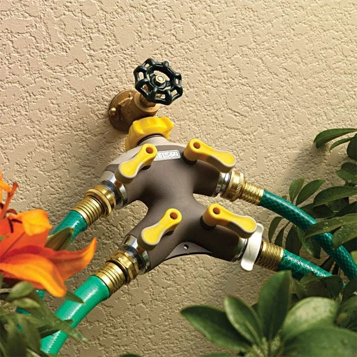 The Nelson High Flow 4 Valve Faucet Adaptor can connect up to four hoses at the same time.