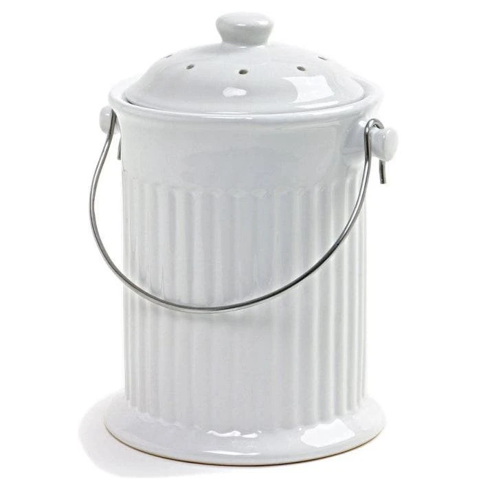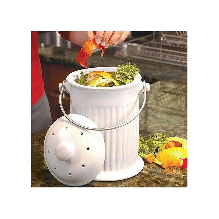 Activated charcoal filters in the lid absorb odors before they can escape. Glazed inside and out for easy cleaning. Stainless steel handle. Includes one filter, lasting up to six months. Additional filters sold separately. Dishwasher safe. Makes a clever housewarming gift, too!