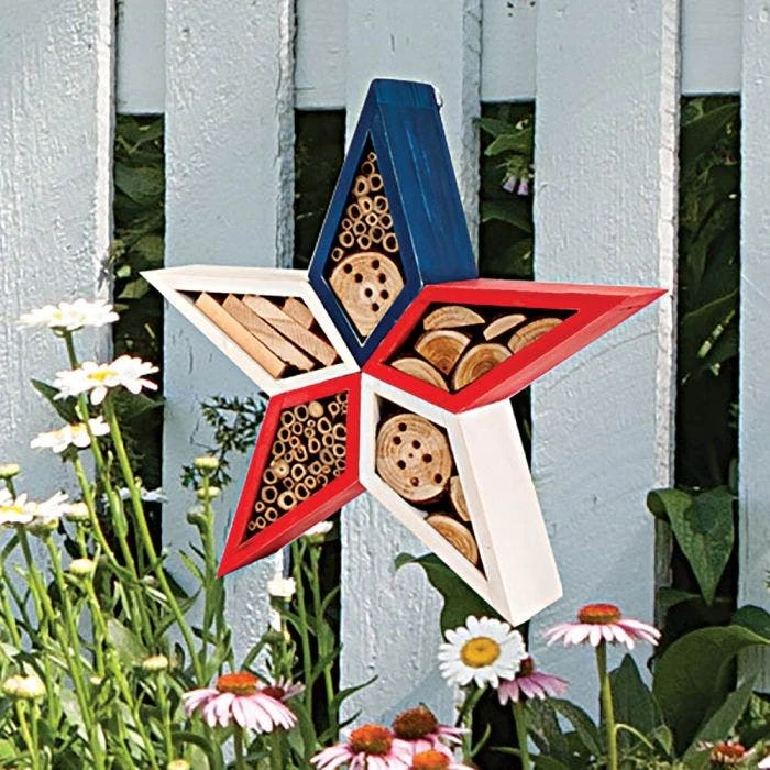 The multi chamber design of this Red, White and Blue Star Insect Shelter attracts the largest variety of beneficial insects including lacewings and lady bugs to help reduce plant damage from pests like aphids and caterpillars. Solitary bees may also use this house, increasing pollination. Hang your insect house about 5-ft high near the area where you want increased pollination and harmful insect protection, like a garden, flower bed or bushes and trees that blossom. Ready to Hang.