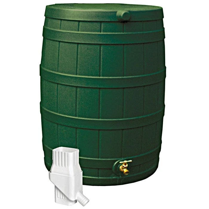 It holds 50 gallons and has a mesh screen to keep out debris. Also comes with the simple to use Diverter Kit to connect to any downspout. This barrel can be linked to other rain barrels and has a flat-back that can sit up against an exterior wall . A standard 3/4″ brass spigot is included. BPA-free plastic construction. Made in the USA.