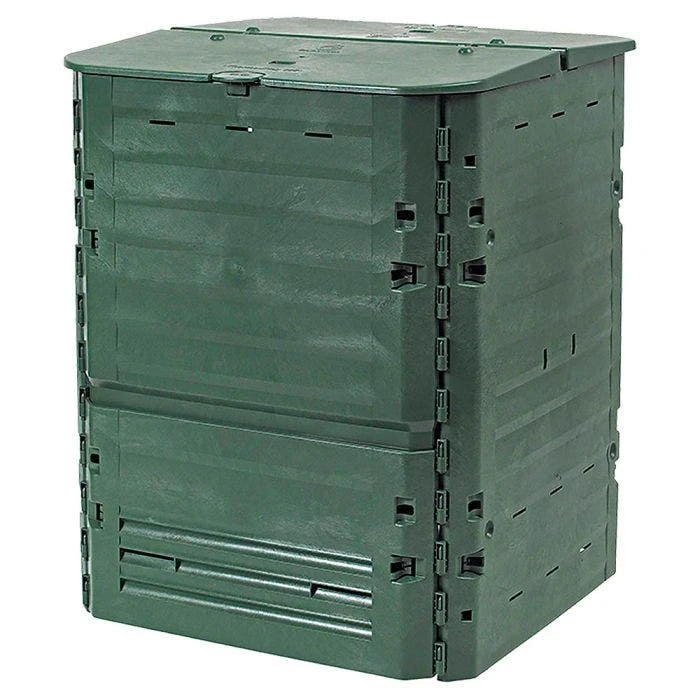 Turn kitchen waste into rich compost! Constructed from Thermolen UV-resistant weatherproof material keeping heat inside which accelerates the composting process. Large lid for easy access in loading and stirring compost. Secure wind-proof latches keep top closed. Panels snap together for easy assembly – no tools required! Folding bottom exit door for removal. Made in Germany.