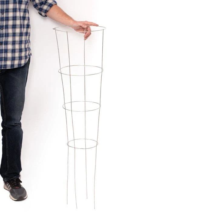 Economically priced. Compare the quality more rings, more legs, heavier wire more protection! Order early to ensure availability! Tapered supports are ideal for tomatoes or vines. Surround plants for complete balance and support. Reusable, tapered design for growth spread of bushy plants. 4 rings, 4 legs, 42-inch overall height. 11.5-inch top diameter. Sold per carton of 5.