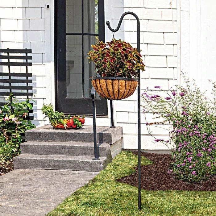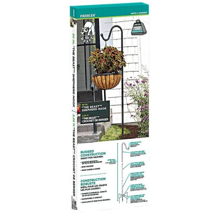The beast shepherd hook creates a stunning showcase for an oversized hanging basket packed with blooms. Super tall one inch/2.54 cm thick tubular steel to support heavy hanging baskets or bird feeders will hold over 30- lbs. Rugged auger bit foot drives into soil to keep shepherd hook from coming ungrounded. This monster 90-inches tall hook is finished with a decorative ball piece on the hook arm and attractive, textured matte black powder-coated finish.
