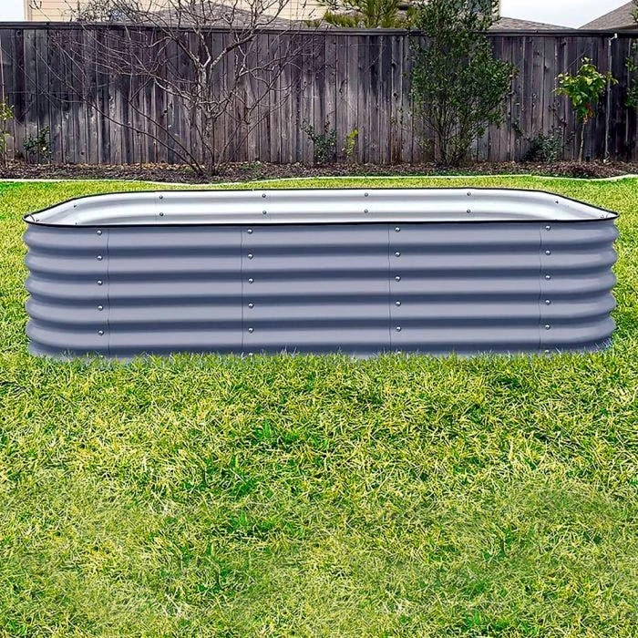 The Vego Garden 9-in-1 Modular Raised Garden Bed creates a bed that stands 17-inches tall and is optimal for root health. Build up to nine different configurations with this compact, modular kit, allowing you to build versatile configurations to fit any space. Long lasting Aluzinc coated metal last up to seven times longer than regular standard galvanized beds. Aluzinc steel will slowly add essential elements of aluminum, zinc and iron are slowly added to the soil. Painted with a highly durable, specialized paint blended for the farming industry that is food -grade and USDA certified. The oval design does not have any sharp corners with a heavy duty rubber safety strip for superior protection from cuts and scrapes when gardening. Each bed comes with a 10 year limited warranty and is available in pearl white, modern grey, or olive green.