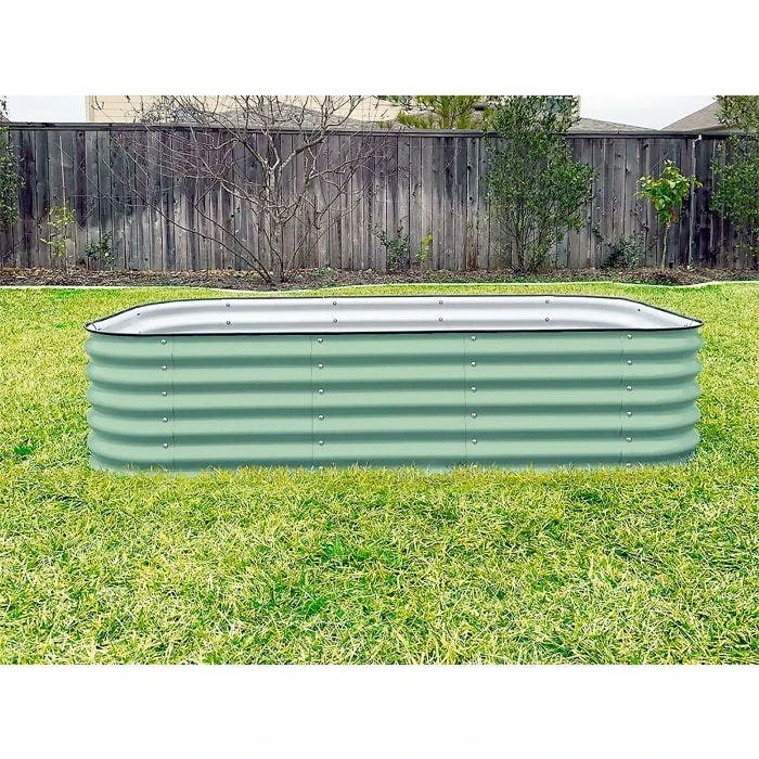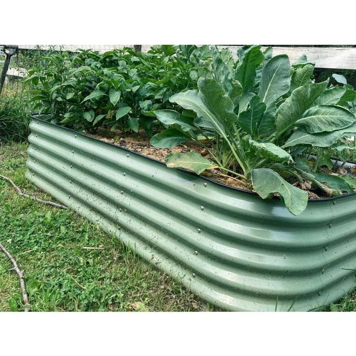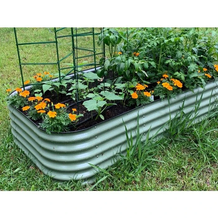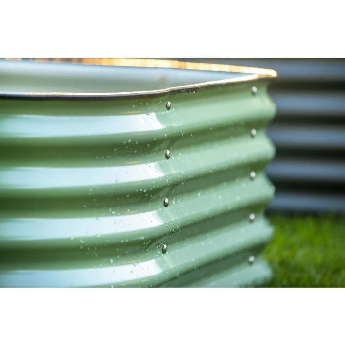 The Vego Garden 9-in-1 Modular Raised Garden Bed creates a bed that stands 17-inches tall and is optimal for root health. Build up to nine different configurations with this compact, modular kit, allowing you to build versatile configurations to fit any space. Long lasting Aluzinc coated metal last up to seven times longer than regular standard galvanized beds. Aluzinc steel will slowly add essential elements of aluminum, zinc and iron are slowly added to the soil. Painted with a highly durable, specialized paint blended for the farming industry that is food -grade and USDA certified. The oval design does not have any sharp corners with a heavy duty rubber safety strip for superior protection from cuts and scrapes when gardening. Each bed comes with a 10 year limited warranty and is available in pearl white, modern grey, or olive green.