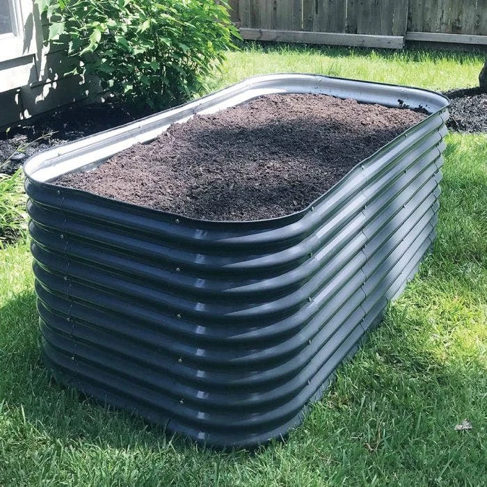 The Extra Tall Vego Garden 9-in-1 Modular Raised Garden Bed creates a bed that stands 32-inches tall and is optimal for root health. Build up to nine different configurations with this compact, modular kit, allowing you to build versatile configurations to fit any space. The higher depth of the bed allows for plenty of room to grow a variety of plants and ample space for the root system to develop strong all while saving you from having to bend over as much. Long lasting Aluzinc coated metal last up to seven times longer than regular standard galvanized beds. Aluzinc steel will slowly add essential elements of aluminum, zinc and iron are slowly added to the soil. Painted with a highly durable, specialized paint blended for the farming industry that is food -grade and USDA certified. The oval design does not have any sharp corners with a heavy duty rubber safety strip for superior protection from cuts and scrapes when gardening. Each bed comes with a 10 year limited warranty and is available in white, grey, or olive green.