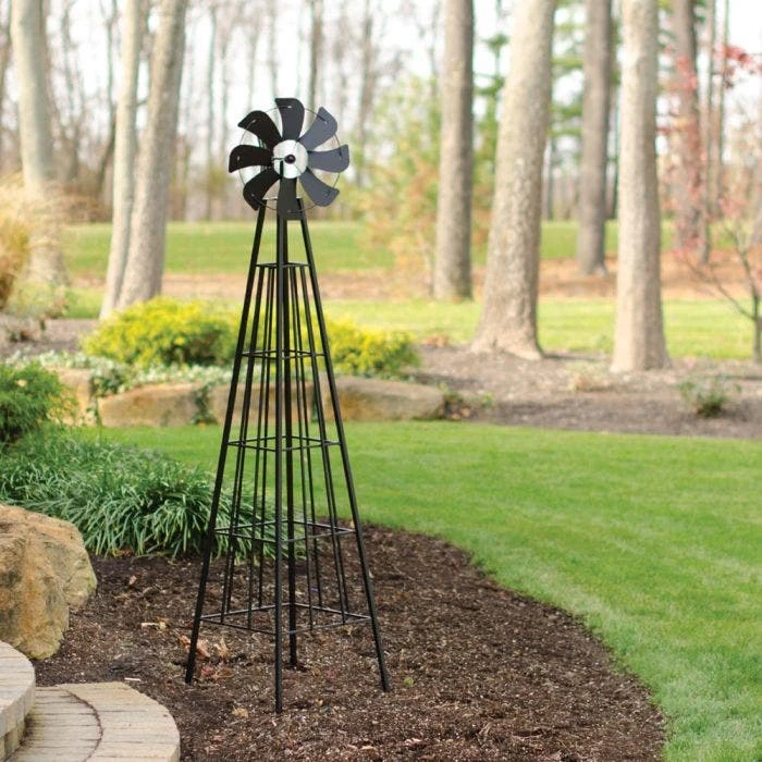 The six foot tall Windmill Obelisk spins freely in the slightest breeze and adds vertical interest to your garden. The four-paneled frame has intersecting vertical and horizontal square bars inside each panel to help support your clematis, sweet peas, morning glories and other climbers. Powder coated black finish over a rugged steel construction.
