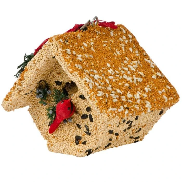 It’s a durable wooden bird house but unlike typical bird houses, this house is beautifully hand decorated with a generous layer of premium bird seed that wrens and other birds will enjoy eating.