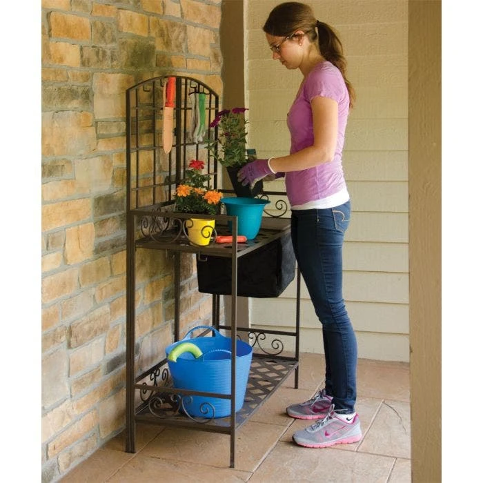 - For indoor or outdoor use Includes a removable canvas soil reservoir Has hooks for hanging tools Diamond-pattern holes punched in the table allow drainage; no water puddles